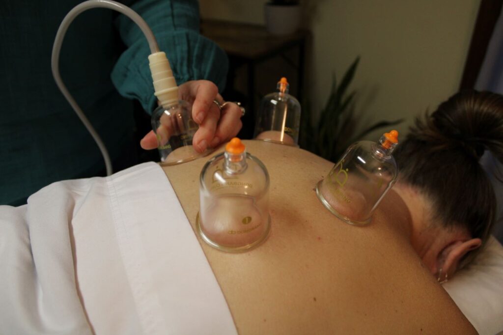 Use of vacuum-pump applied cups to enhance blood flow and move fascia to provide pain relief – may be placed statically or used in a gliding motion